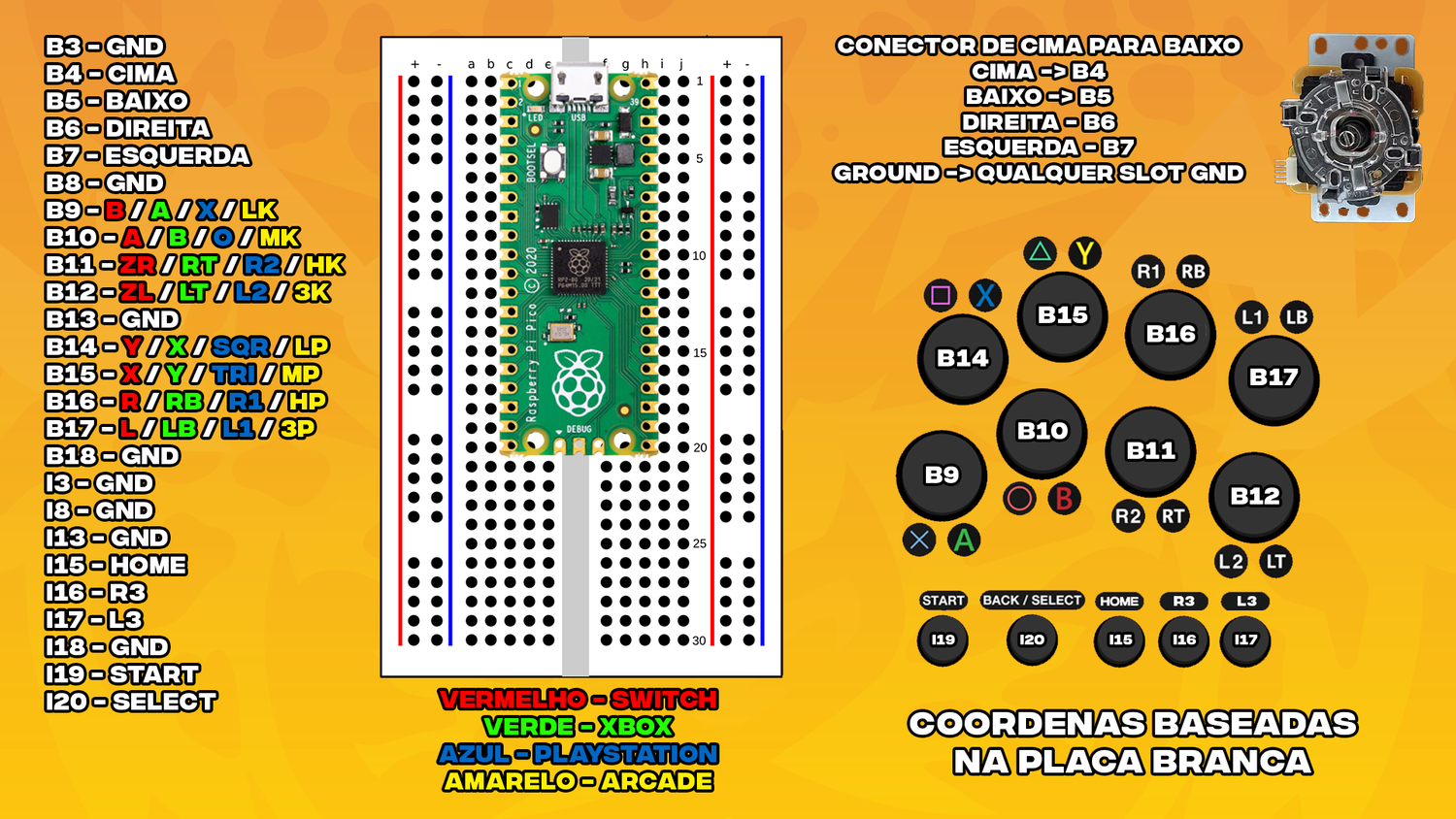 Para inicializar no modo Bootsel (para flashar um novo firmware, por exemplo), segure os botões SELECT + START + UP e conecte seu controle.